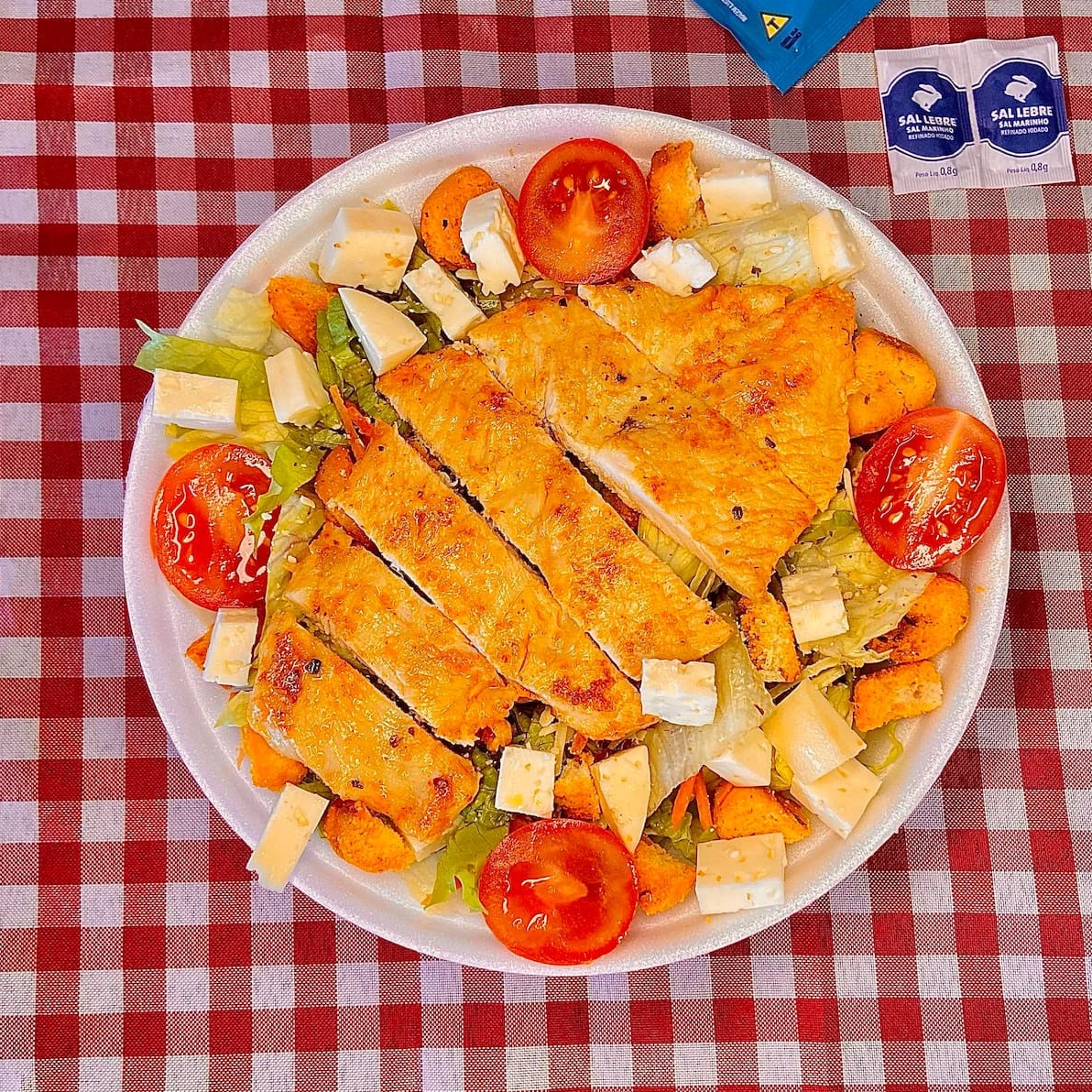 Refeição completa e saudável: frango grelhado, queijos, croutons crocantes, salada fresca e tomates. A Caesar perfeita para matar a fome com leveza e sabor.