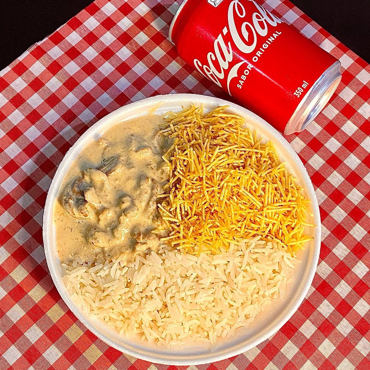 Deliciosa comida caseira: arroz, batata palha, Strogonoff de carne e salada do Dia. Acompanha coca lata Original 350ml.
