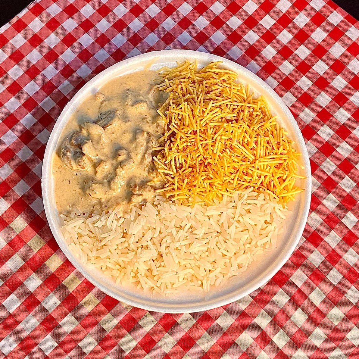 Deliciosa comida caseira: arroz, batata palha, Strogonoff de carne e salada do Dia.