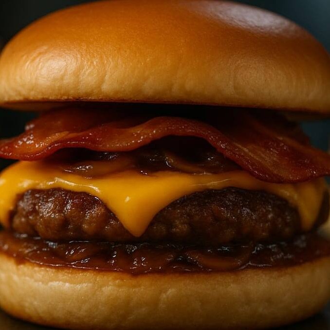 Pão, Hambúrguer artesanal, Queijo cheddar, Bacon e Maionese caseira.