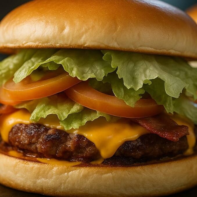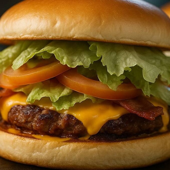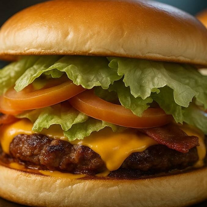 Pão, Hambúrguer artesanal, Queijo cheddar, Bacon, Alface Americana, Tomate e Maionese caseira.
