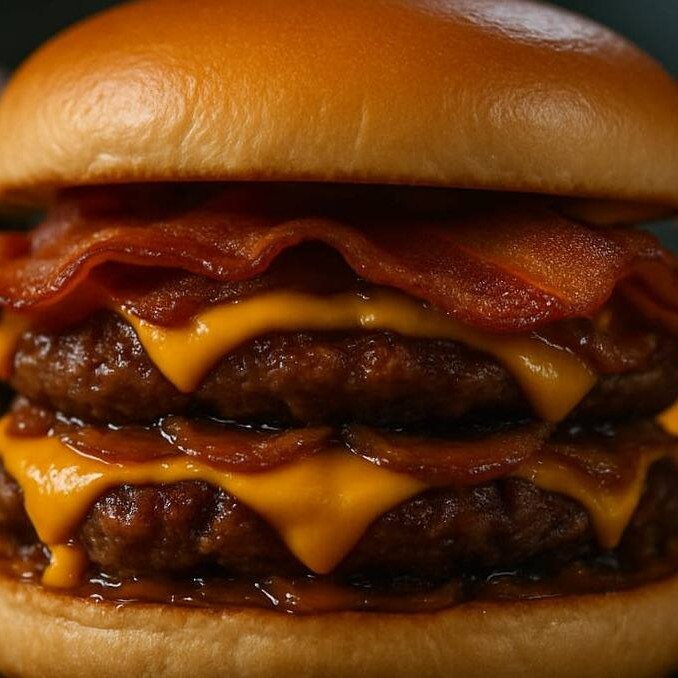 Pão, 2 Hambúrguer artesanal, Queijo cheddar, Bacon, Cebola Caramelizada, Alface Americana, Tomate e Maionese caseira.