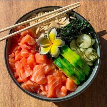 Delicioso Poke Feito Com Ingredientes Frescos E Selecionados, Acompanha: Gohan, Sunomono, Cebola Roxa, Tomate Cereja, Mix De Folhas, Manga, Couve Cryspie E Salmão Maçaricado Finalizado Com Molho Tarê.