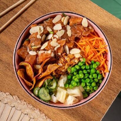 Delicioso Poke Feito Com Ingredientes Frescos E Selecionados, Acompanha: Gohan, Sunomono, Ervilha, Cenoura Ralada, Chips De Batata Doce, Laminas De Amêndoas E Cubos De Salmão Marinado