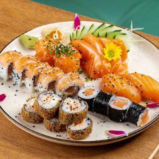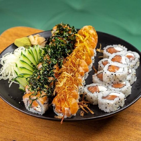 5 Uramaki Phila, +5 Uramki Kani, + 5 Special De Salmao Maracuja, + 2 Niguiri 1 Peixe Branco 1 Salmao, + 2 Joe Salmao, + 6 Sashimis (3 Branco, 3 Salmao)