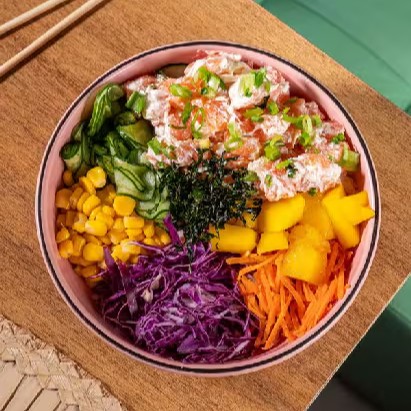 Delicioso Poke Feito Com Ingredientes Frescos E Selecionados, Acompanha: Gohan, Sunomono, Milho, Cenoura Ralada, Repolho Roxo, Manga, Couve Cryspie E Salmão C/Cream Cheese