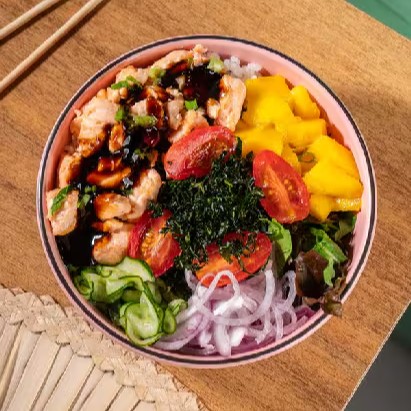 Delicioso Poke Feito Com Ingredientes Frescos E Selecionados, Acompanha: Gohan, Sunomono, Cebola Roxa, Alface, Abacate, Chips De Batata Doce E Frango Teriaki.