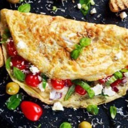 Delicioso Omelete, 3 Ovos, Queijo Mussarela, Tomate Cereja, Cheiro Verde E Salada.