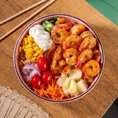 Delicioso Poke Feito Com Ingredientes Frescos E Selecionados, Acompanha: Gohan, Sunomono, Tomate Cereja, Cebola Roxa, Milho, Abacaxi, Cream Cheese E Camarão Grelhado.