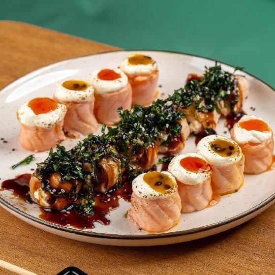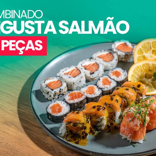 5 Uramaki Philafelfia, + 5 Especial Salmão Molho De Maracujá, + 5 Hossomaki De Salmão, + 4 Sashimis Salmão, + 2 Joes De Salmão
