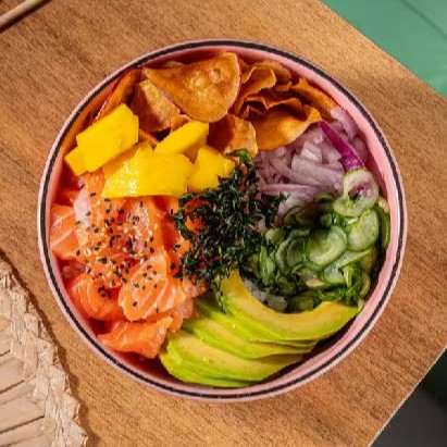 Delicioso Poke Feito Com Ingredientes Frescos E Selecionados, Acompanha: Gohan, Sunomono, Cebola Roxa, Manga, Abacate, Couve Cryspie , Chips De Batata Doce E Cubos De Salmão Fresco.