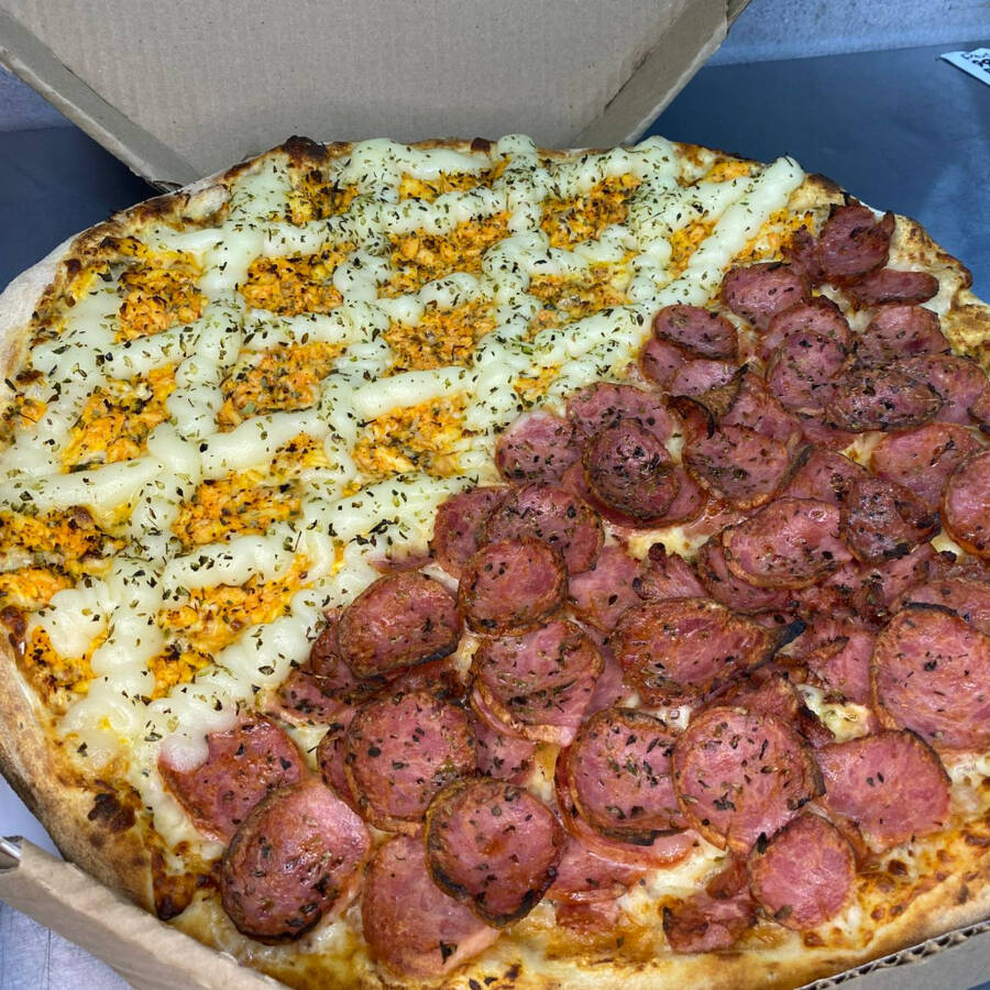 Saborosa pizza com ingredientes preparado na melhor forma, a querida e famosa pizza de calabresa e frango catupiry que conquista todo mundo!!