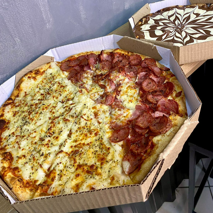 O combo queridinho! Pizza Grande 8 fatias saborosas de pizza salgada + Pizza Broto 4 fatias doces! Escolha seus sabores favoritos :))