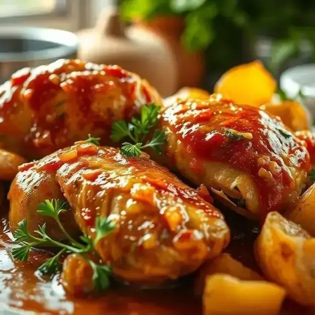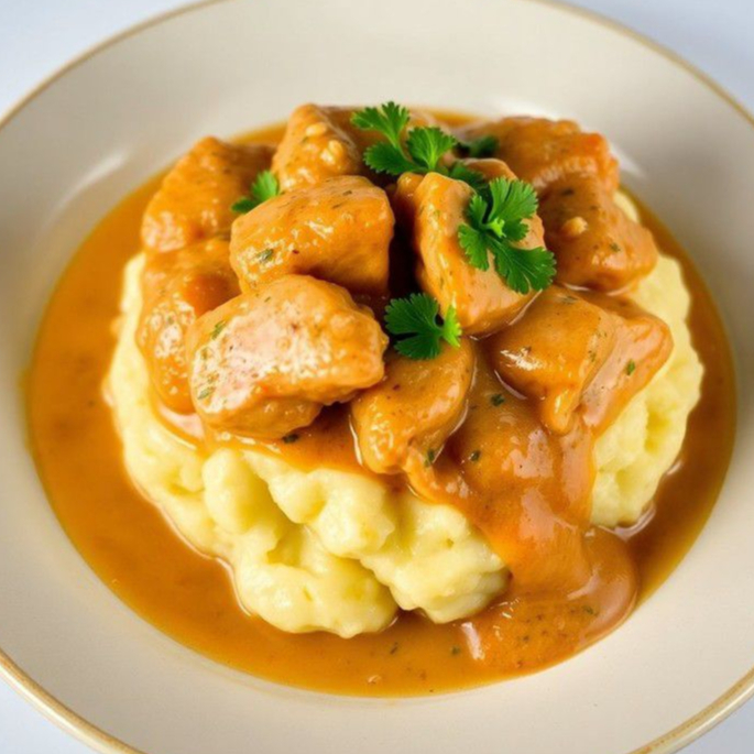 Purê de Batata com Strogonoff de Frango e Batata Palha