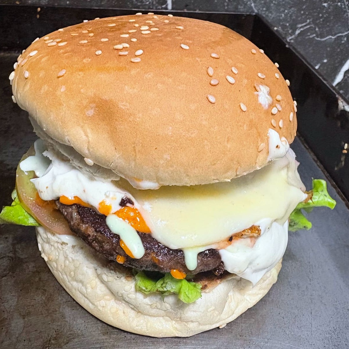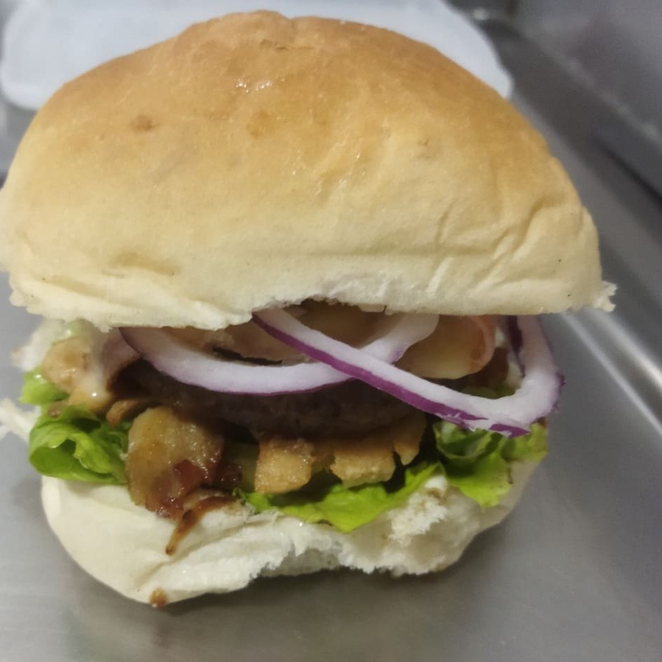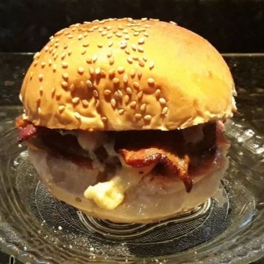 Pão, 2 hambúrgueres , creme de alho ,cheddar ,molho barbecue ,bacon