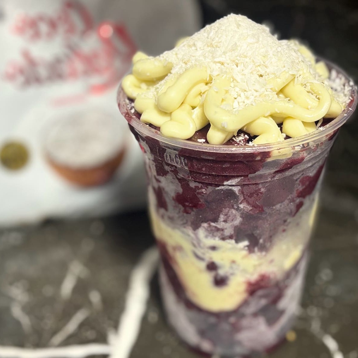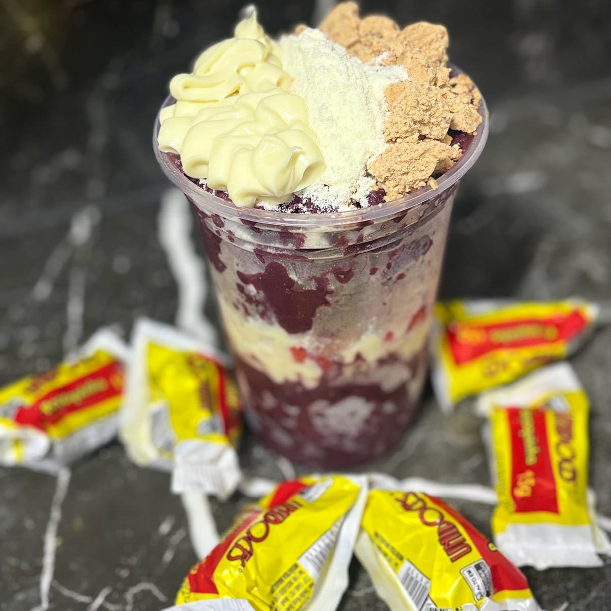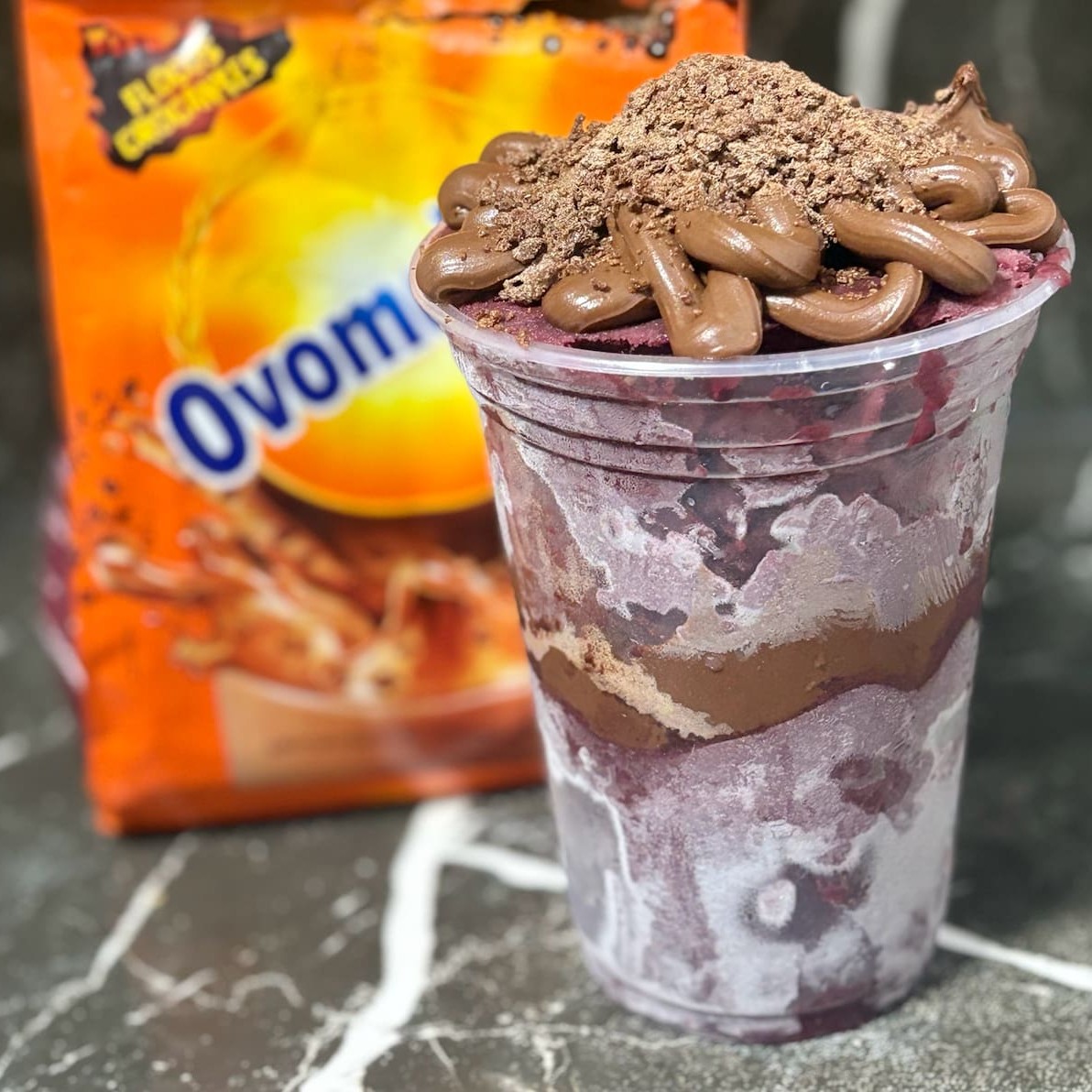 Açaí de 500 ml com creme de avelã e Ovomaltine.