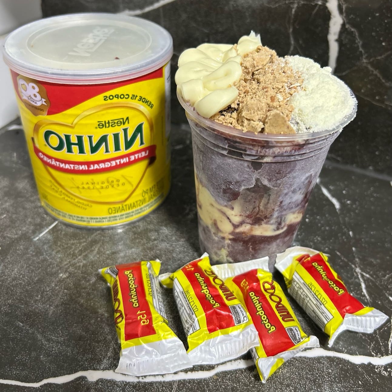 Açaí de 500 ml com creme de Ninho, coco ralado e leite em pó.