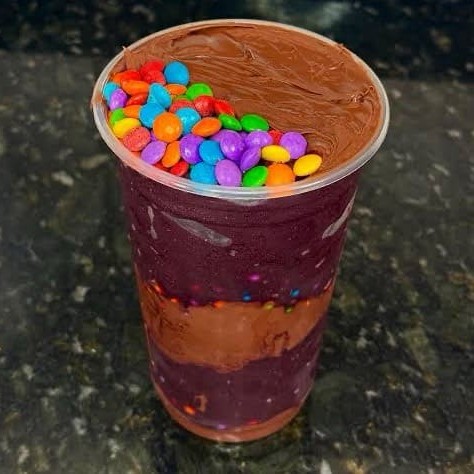 Açaí de 500 ml com Confete, creme de avelã e leite em pó.