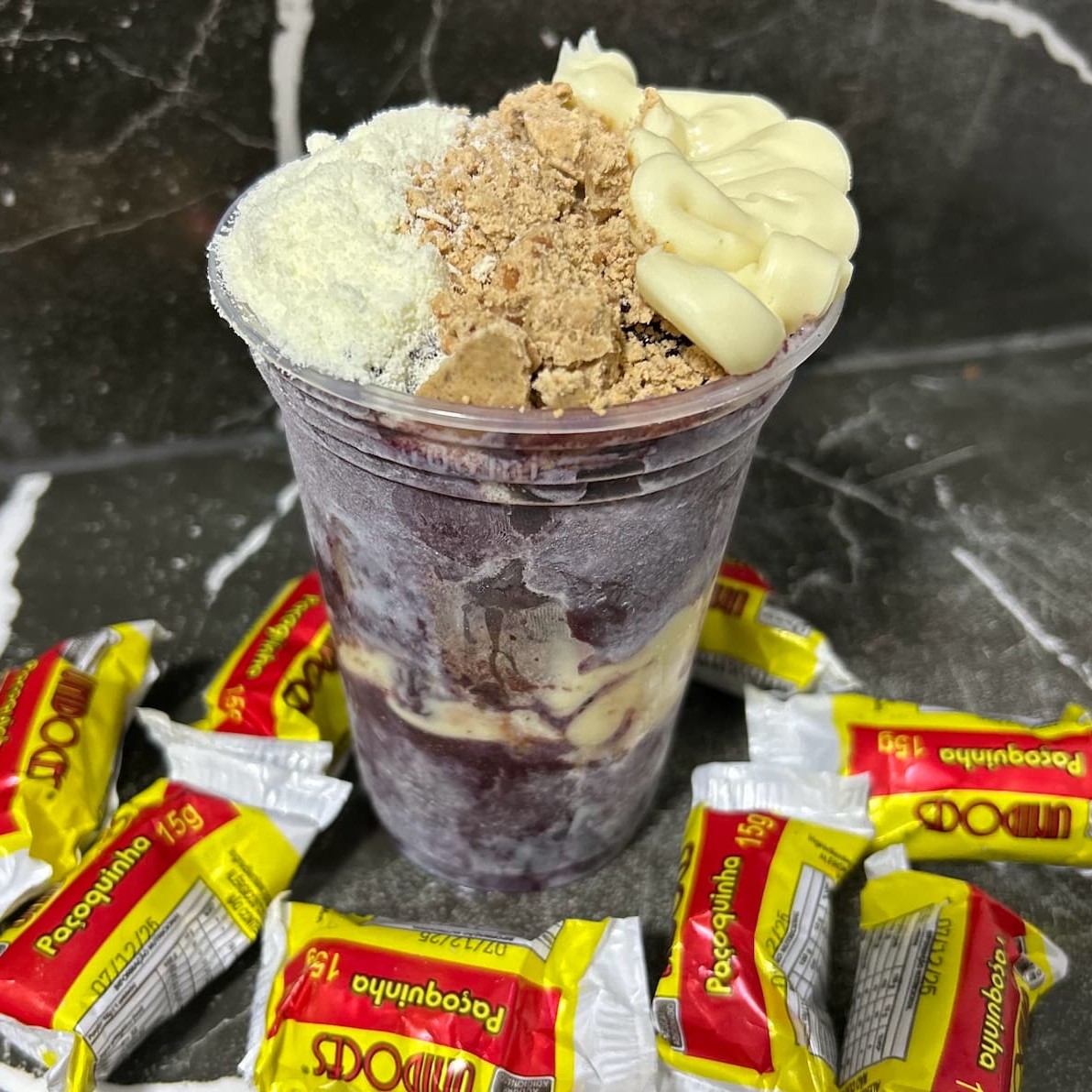 Açaí de 300 ml com paçoca, leite em pó, leite condensado e creme de Ninho.