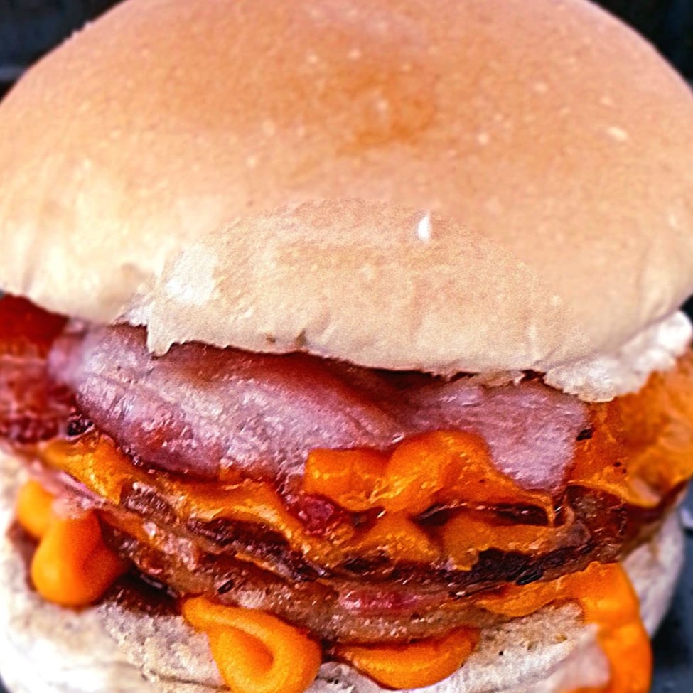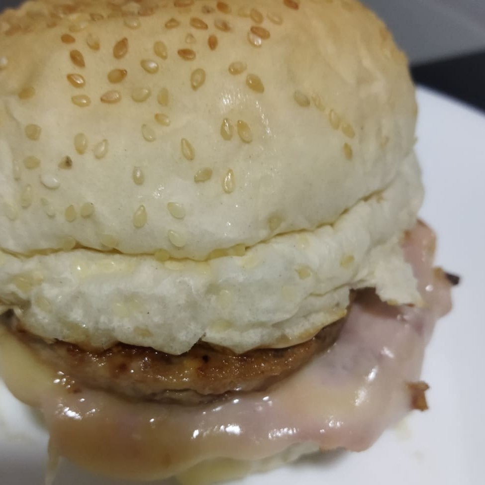 Pão, hambúrguer, presunto, queijo, molho barbecue, bacon , maionese