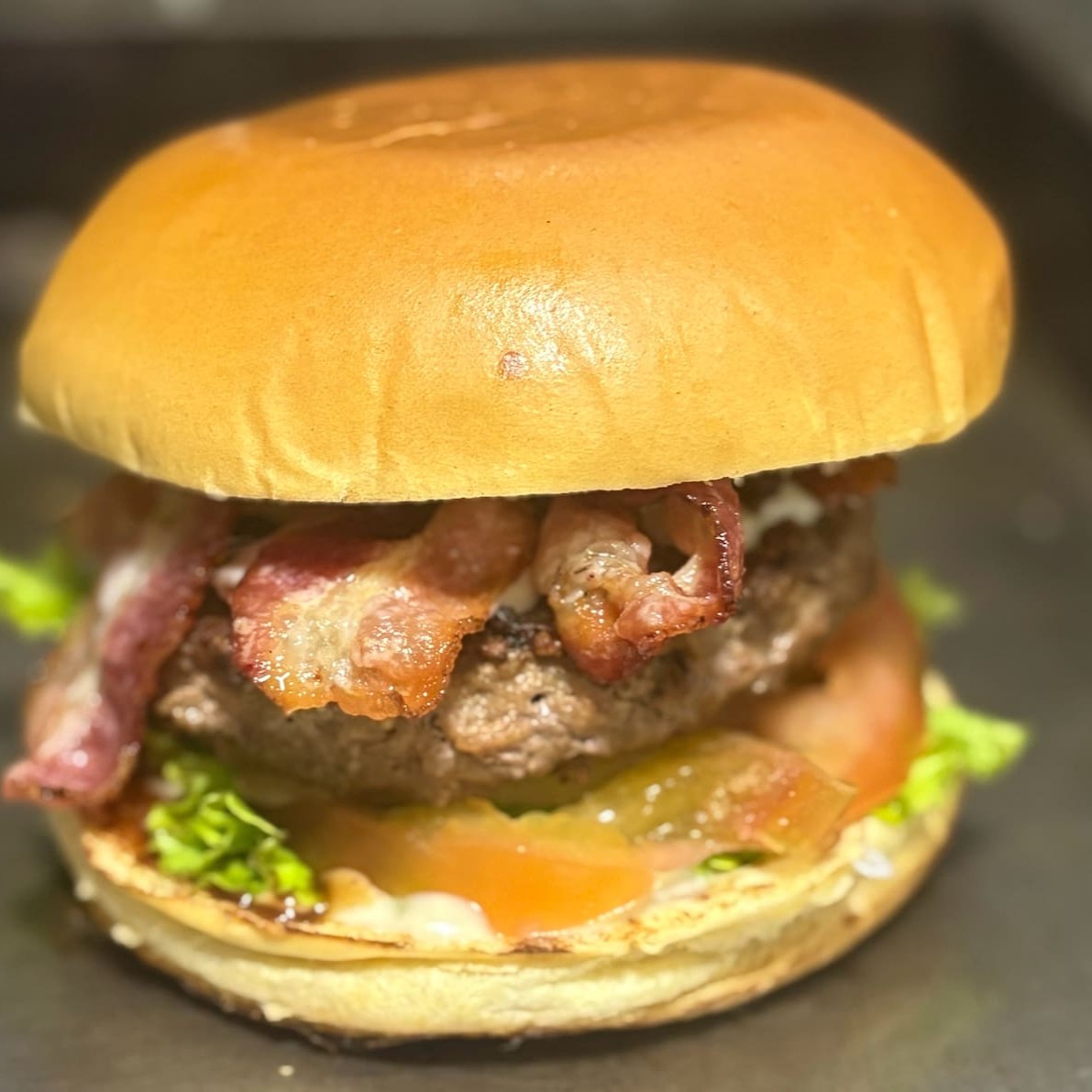 Um hambúrguer artesanal de 150g suculento, acompanhado de presunto, queijo derretido, bacon crocante, alface fresca e tomate, finalizado com maionese especial e molho Bling Jack no pão macio.