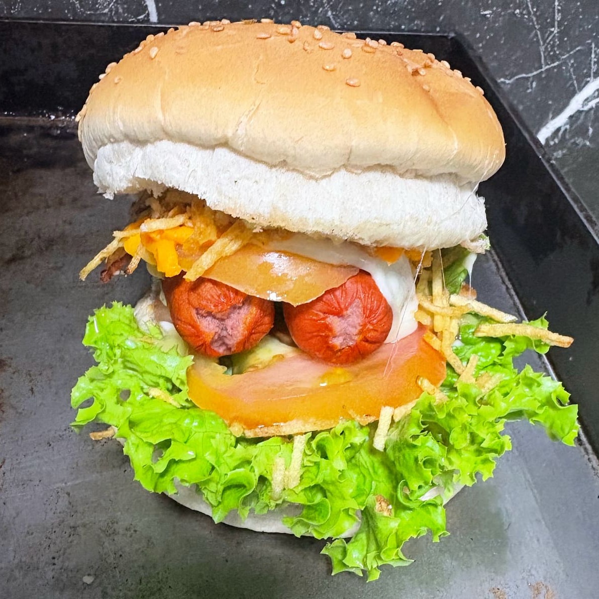 X bacom, x salada ,x burguer 400g de calabresa e molhos