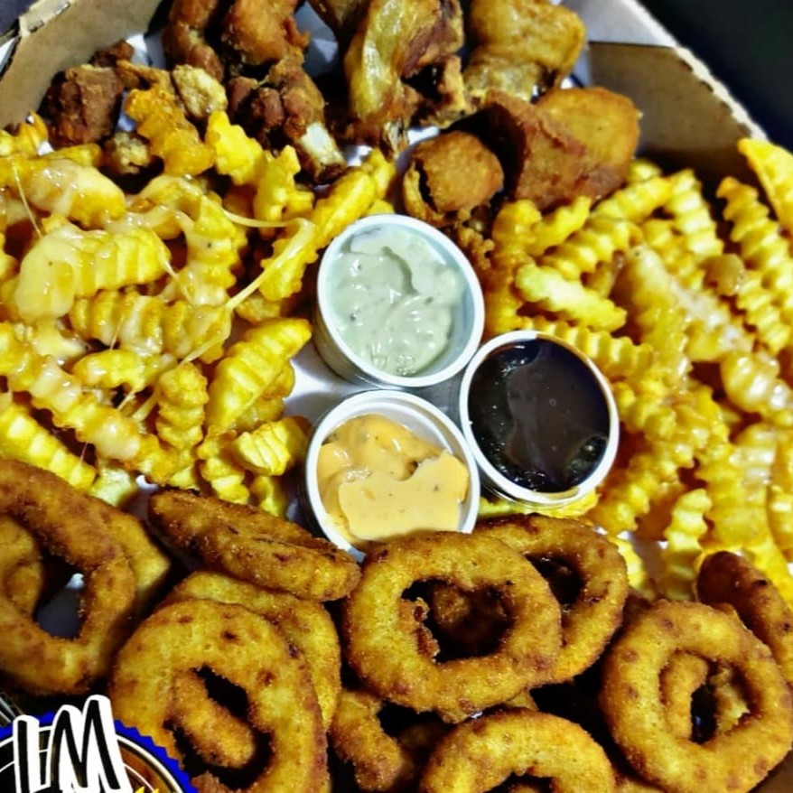 300 gramas de batata e cheddar mais 300 gramas de anel de cebola mais 300 gramas de calabresa