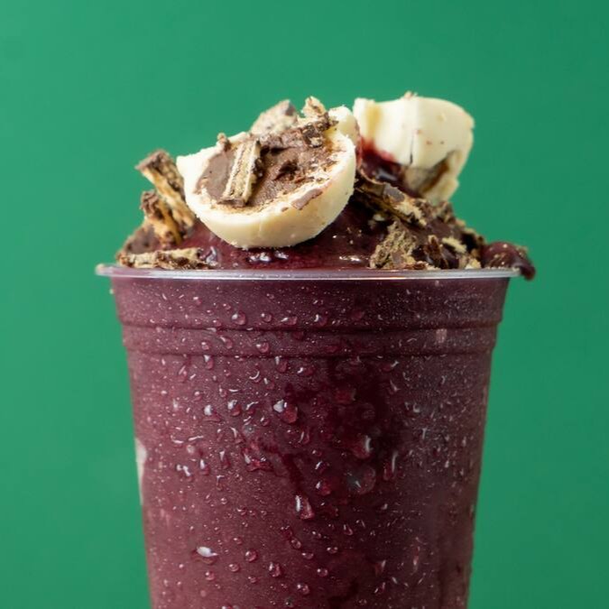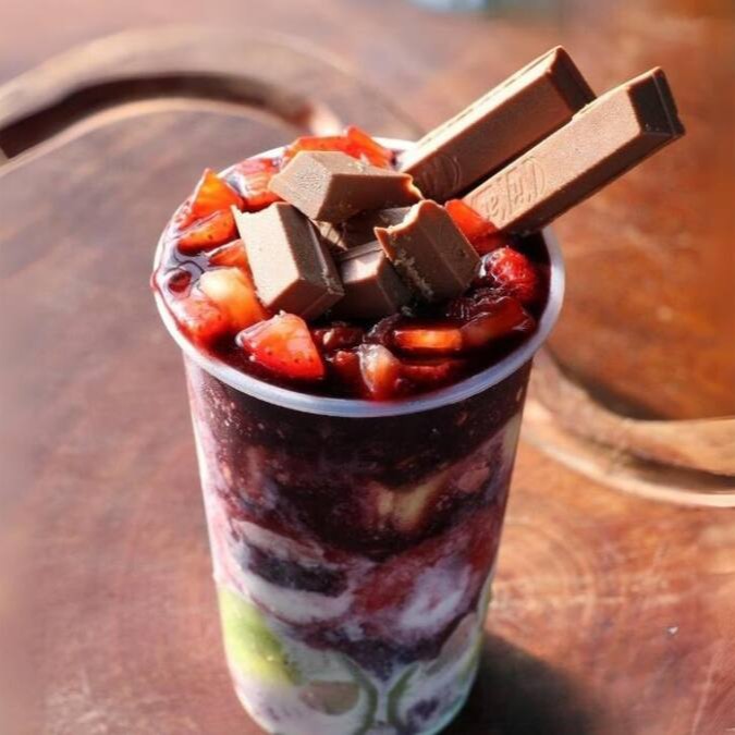 Feito com Nosso Açaí Premium e Cremoso Acompanhado de Leite Condensado, Leite Ninho, Creme de Avelã, Morangos Frescos e Kitkat em Pedaços.