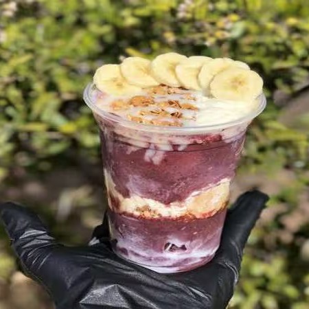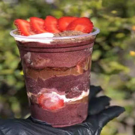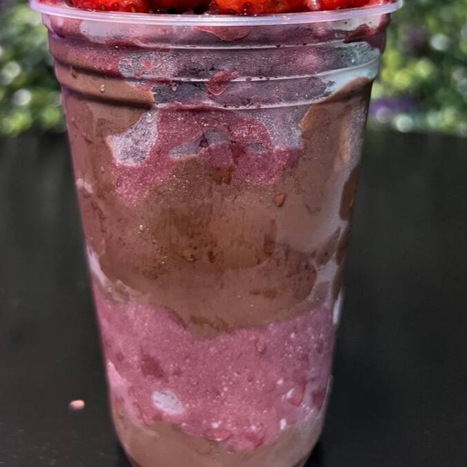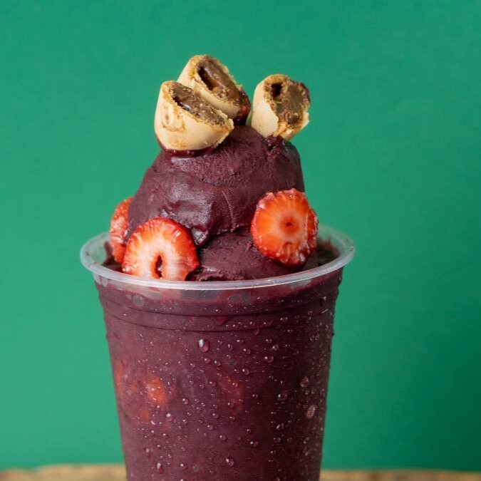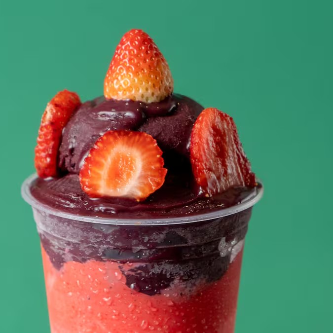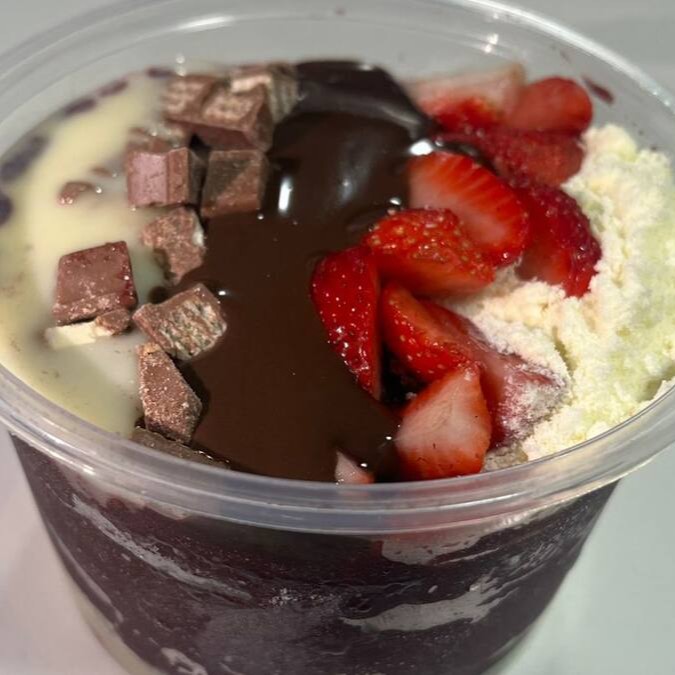 Nosso Cremoso Açaí Premium com Leite Condensando, Leite em Pó, Morangos Frescos e Creme de Avelã.
