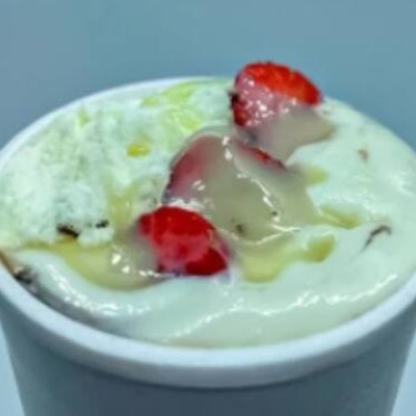 Copo de 300ml do Nosso Açaí Premium Cremoso Acompanhado de Leite Condensado, Leite Ninho e Morangos Frescos.