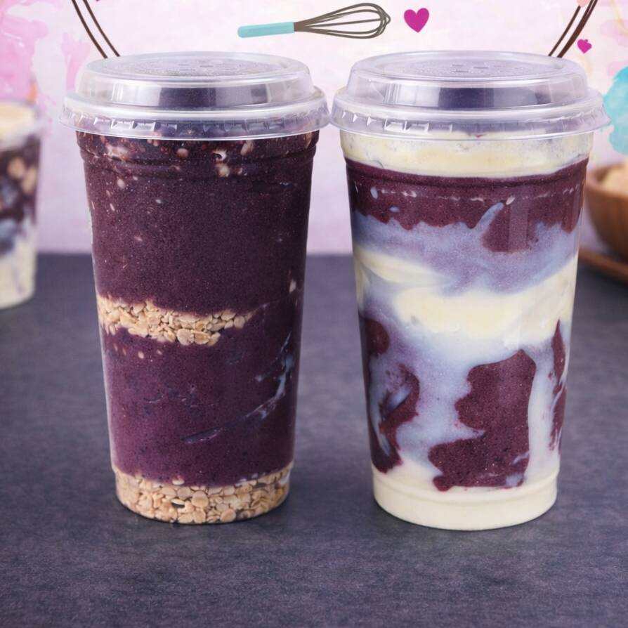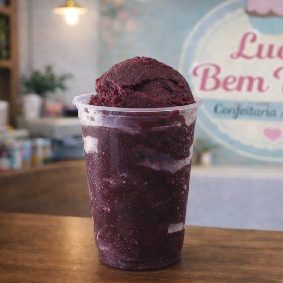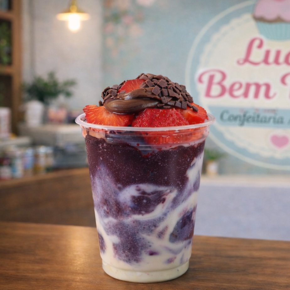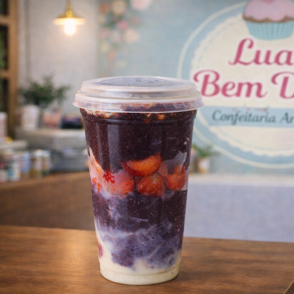 Copo delicioso, com açai, creme de avelã, morangos e leite condensado. Tampa Baixa