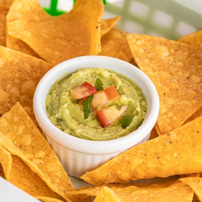 70g de tortilla chips (tortilla de milho frita) + 100ml de guacamole (abacate, tomate, cebola, limão, coentro e temperos).