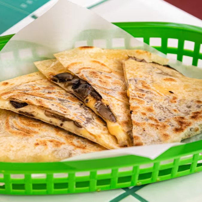 Quesadilla de tortilla de trigo tostadinha recheada com mix de queijos e cogumelos salteados.
