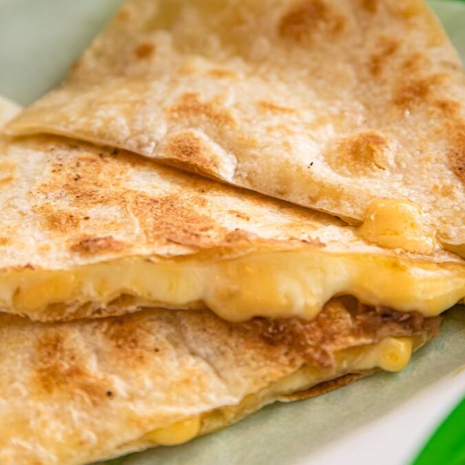 Quesadilla de tortilla de trigo tostadinha recheada com mix de queijos.