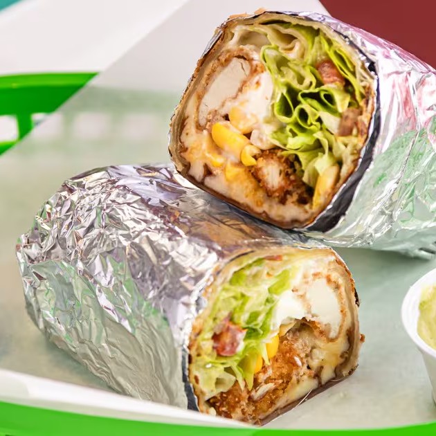 Burrito de frango empanado na farinha panko, queijo, alface, pico de gallo (tomate, cebola, coentro, limão e sal), maionese de abacate, milho e sour cream, abraçados por uma tortilla de trigo tostadinha.
