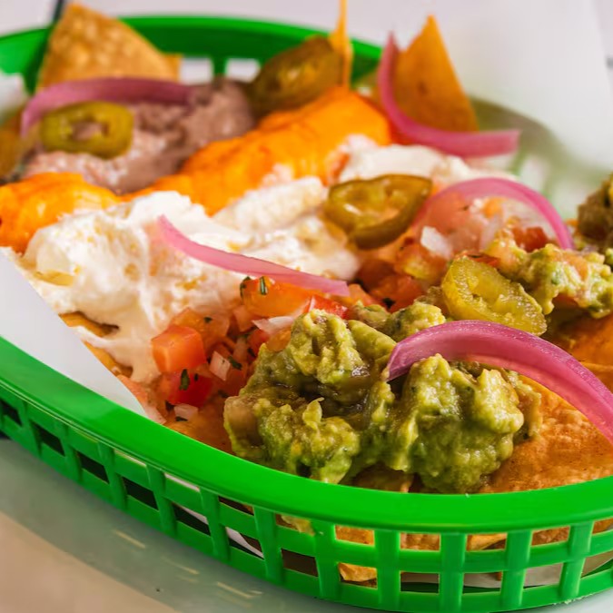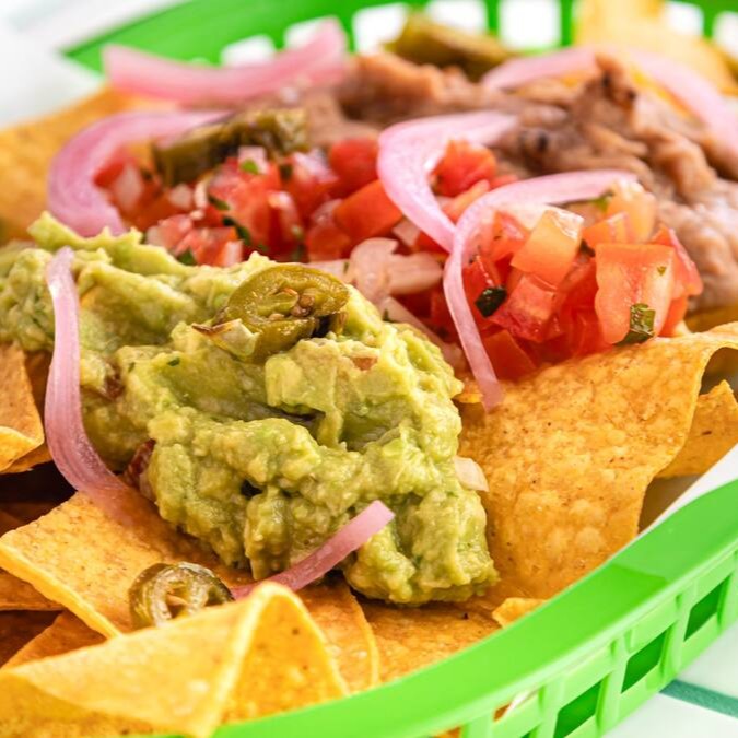 Tortilla chips coberta com tudo que há de bom: guacamole, sour cream, frijoles, cheddar, pico de gallo, jalapeno e pickles de cebola roxa. Uma explosão de sabores!