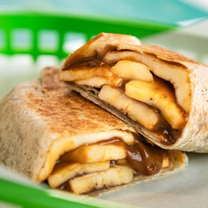 Burrito com queijo coalho tostadinho, doce de leite, banana e canela. Onde o nordeste brasileiro encontra o México!