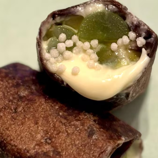 Burrito doce com tortilla de cacau recheado com chocolate branco, flocos crocantes e uva verde.