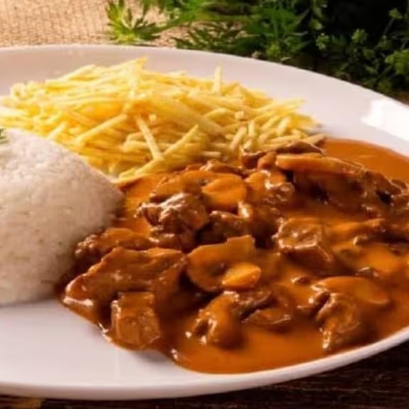 Delicioso strogonoff preparado com carne de primeira, cebola e cogumelos paris fritos na manteiga artesanal, ketchup, mostarda, pimenta do reino moída na hora e creme de leite. Para acompanhar, um arroz branco soltinho e batata palha.Nosso strogonoff é preparado na hora, seguimos um padrão de 100g da Proteína em cada prato, além dos molhos, cebola e cogumelo.