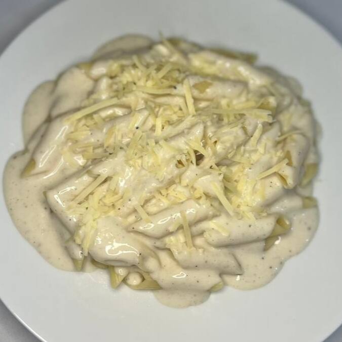 Macarrão tipo penne com molho bechamel (molho branco).