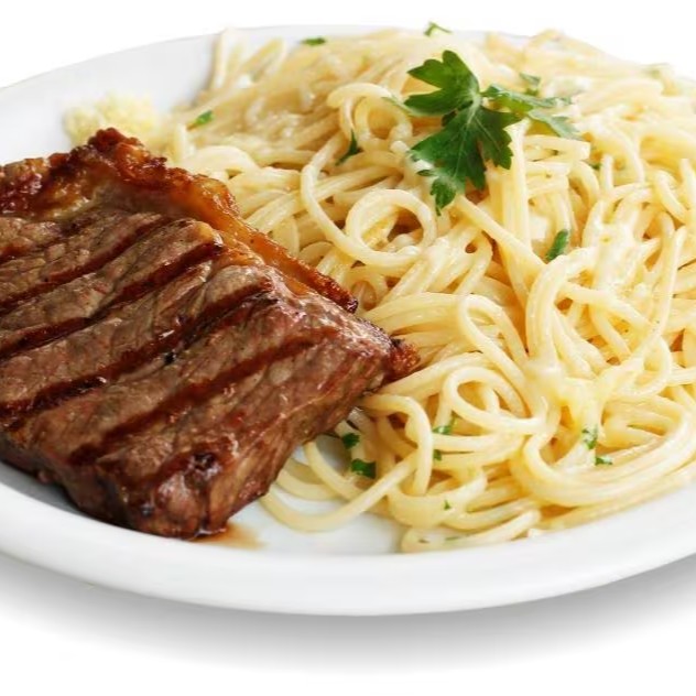 Acompanha: um delicioso espaguete ao molho 4 queijos com 150g de alcatra