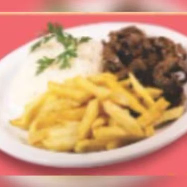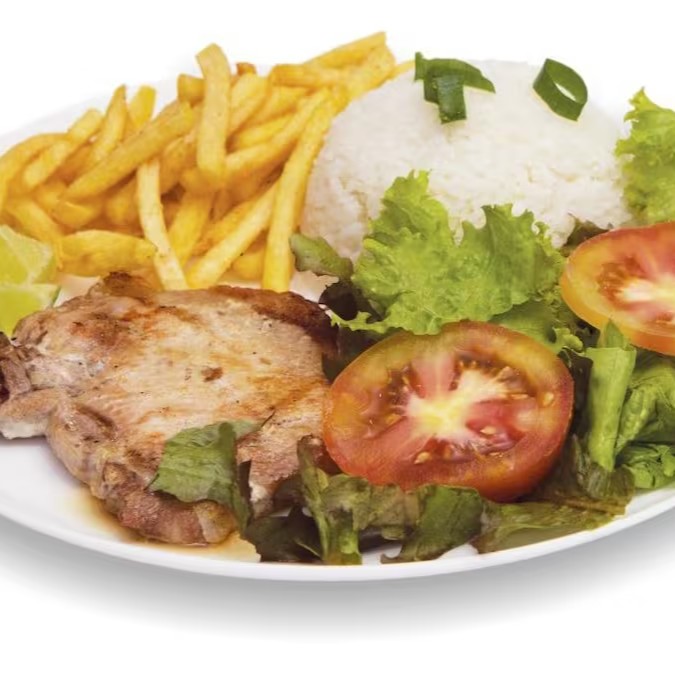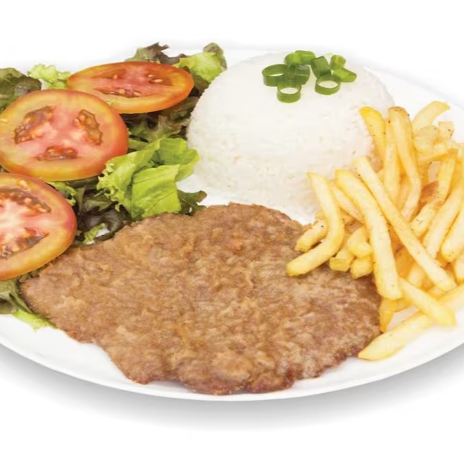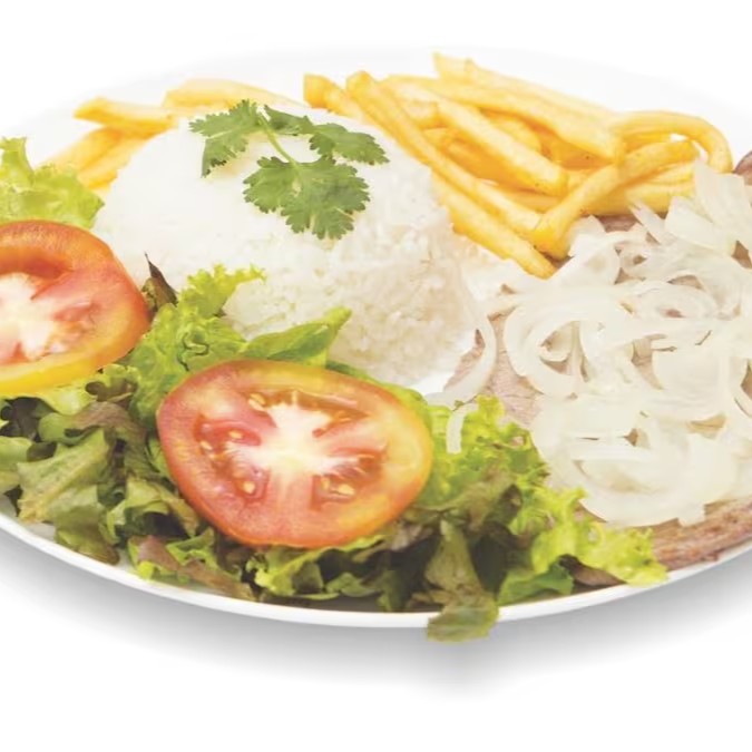 Acompanha: um delicioso arroz, feijão, fritas e salada.