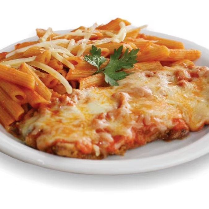 Acompanha: um delicioso Penne com molho ao sugo e Frango à parmegiana.