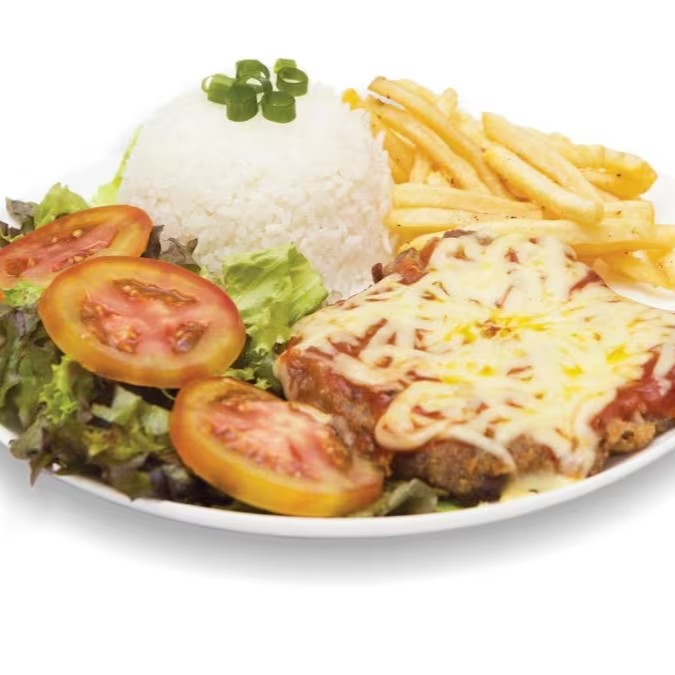 Frango a Parmegiana, acompanha: arroz, feijão, batata frita e salada