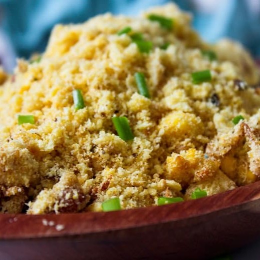 Farofa feita com ovo, bacon, azeitonas fatiadas e calabresa.