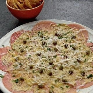 Finas fatias de filet mignon, molho especial da casa, alcaparras, parmesão e torradas de alho.