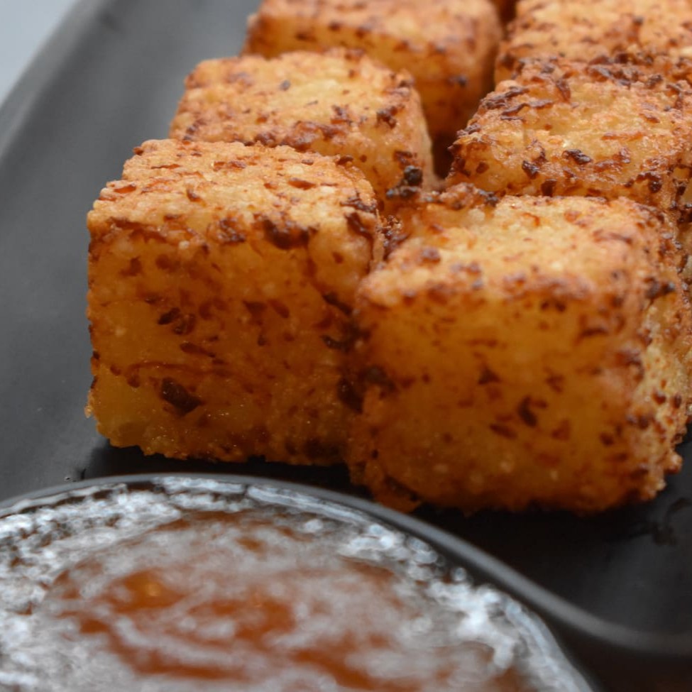 Porção de dadinho de tapioca. Acompanha uma geleia agridoce de pimenta. Serve como entrada para 1 pessoa.