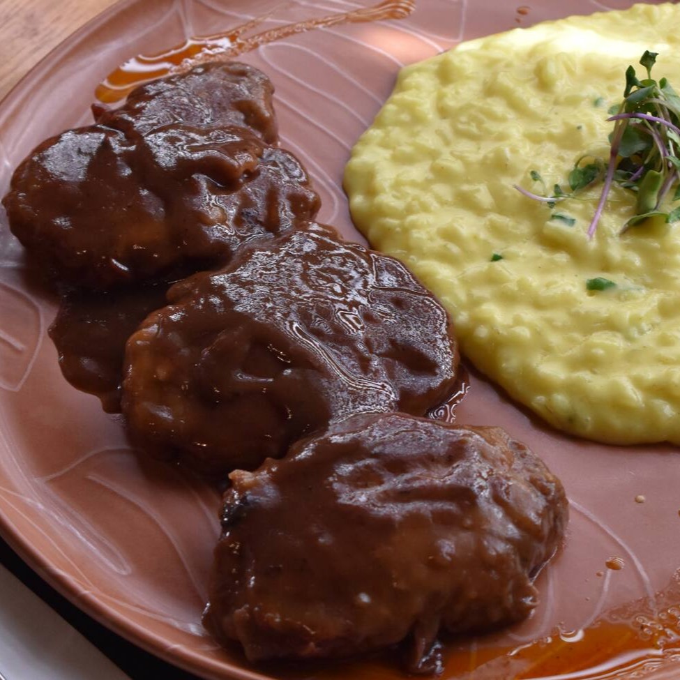 Escalope de mignon com presunto di parma e sálvia, acompanha risoto de açafrão.