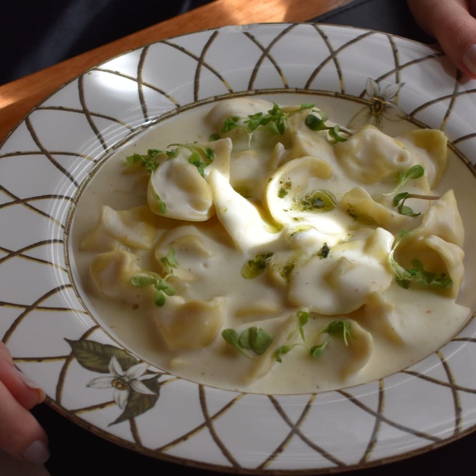 Serve 1 pessoa. Massa verde da casa. Tortellone recheado com ricota.