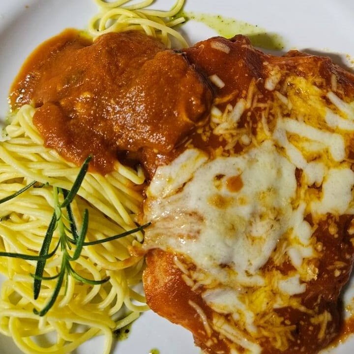 Frango à milanesa, molho sugo, acompanha massa artesanal spaguetti